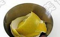 2、用小刀将柚子皮削下来,削的时候一定要薄,尽量只削下黄色部分,白色部分可根据自己口味取舍。柚子的第一层是柚子皮,这是柚子祛痰镇咳的精髓所在,然后是柚子皮和柚子果肉之间的白瓤,这是柚子最苦的地方,可以根据自己的口味取舍。(这道程序很关键哦~~~~第一次做,还是把白色的都去掉比较稳妥点,我怕太苦。)