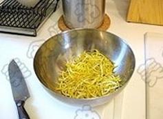 3、将柚子皮切成丝,用食盐用力揉搓柚子皮,使柚子皮中的苦味析出,再用清水浸泡半小时,这个步骤可重复两到三次。 (最后的时候可以咬咬柚子皮,看苦味重不重~~泡完的水会呈现明显的黄绿色)